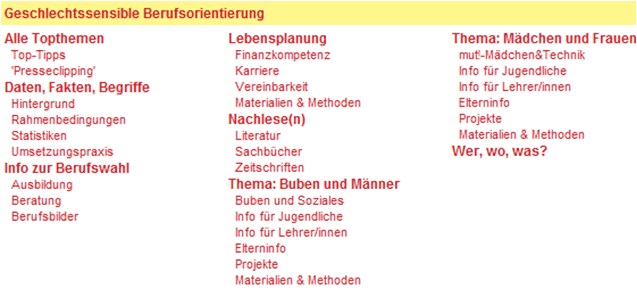 Dieser Menüpunkt beinhaltet für Lehrerinnen und Lehrer Informationen zu Methoden, Materialien und Projekten als Anregung für geschlechtssensiblen Berufsorientierungsunterricht oder Umsetzung im Beratungsprozess. Für Schülerinnen, Schüler und deren Eltern gibt es zahlreiche Links zur berufsbezogenen Recherche.